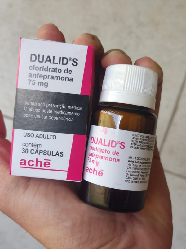 O cloridrato de anfepramona é um remédio para emagrecer que tira a fome porque atua diretamente no centro da saciedade, suprimindo assim o apetite. Também vendido como Dualid, pode ser encontrado em comprimidos de 25mg ou de liberação lenta de 75 mg.